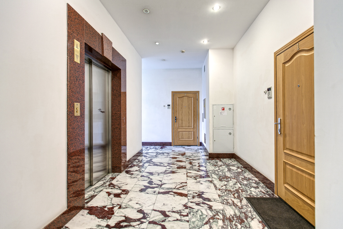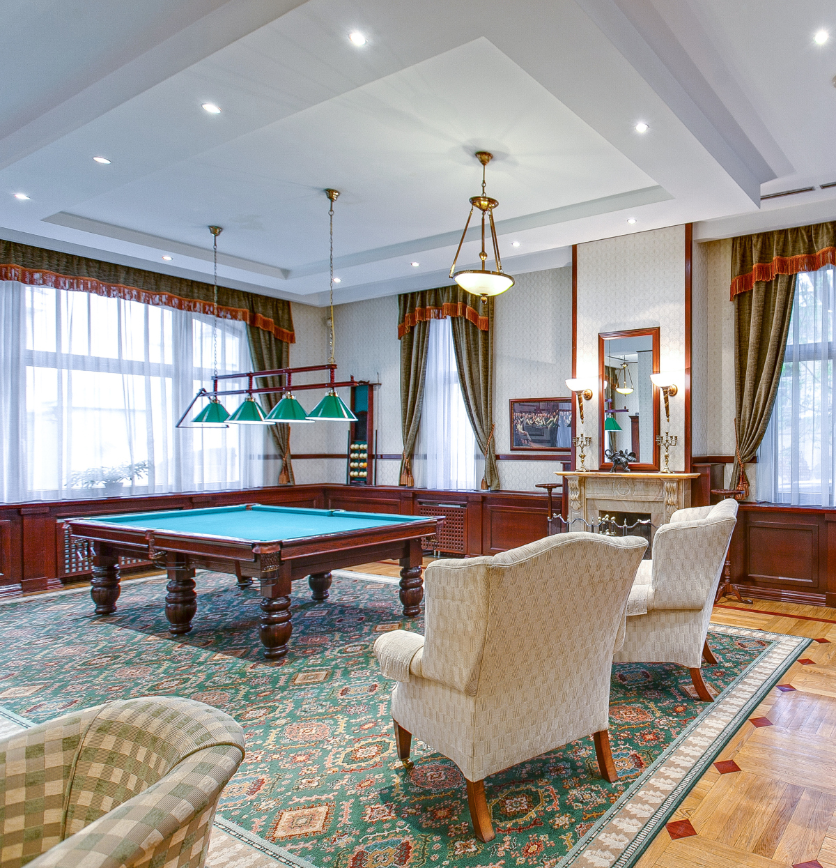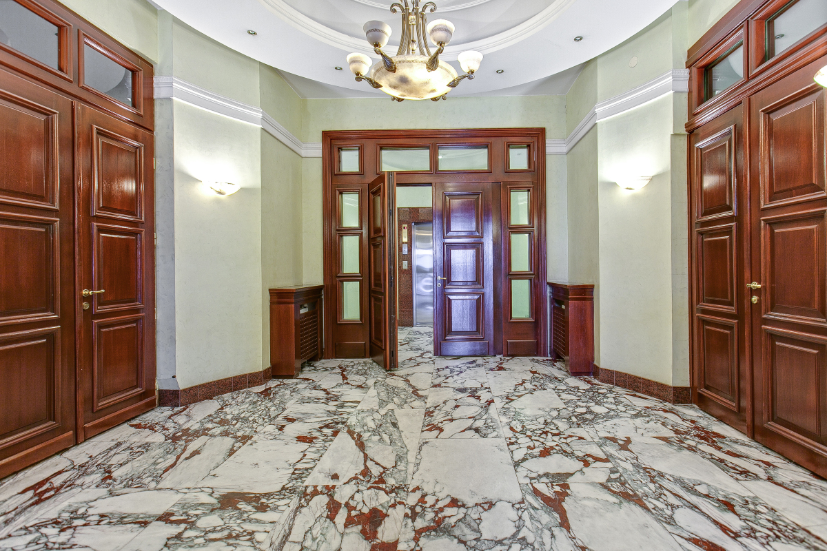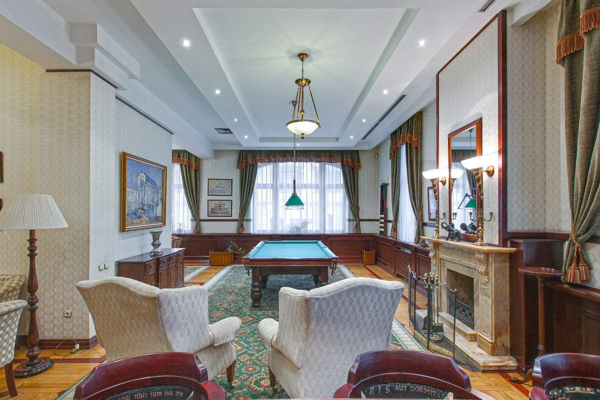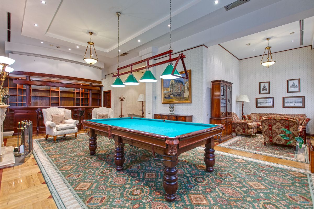 На первом этаже расположено элегантное лобби с мраморным полом, декорированными гранитом стенами и массивными дверьми из ценной породы дерева. Для жильцов открыта каминная комната, где можно поиграть в бильярд и посидеть за барной стойкой в узком кругу друзей. Заняться спортом теперь возможно в любое удобное время — на первом этаже работают тренажерный зал и бассейн. Во дворе среди пышной зелени установили небольшую беседку и скамейки для отдыха.